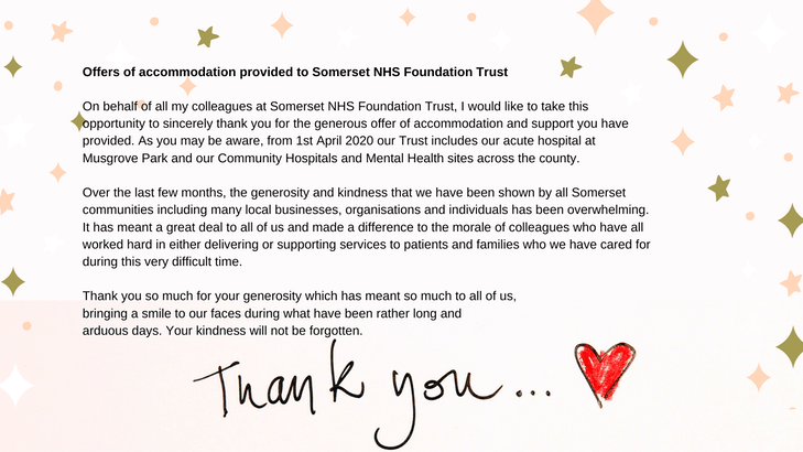 HOST was able to provide support for NHS Somerset Foundation Trust when they needed it most by providing them with free accommodation for their team members who needed a place to stay during these hard times.